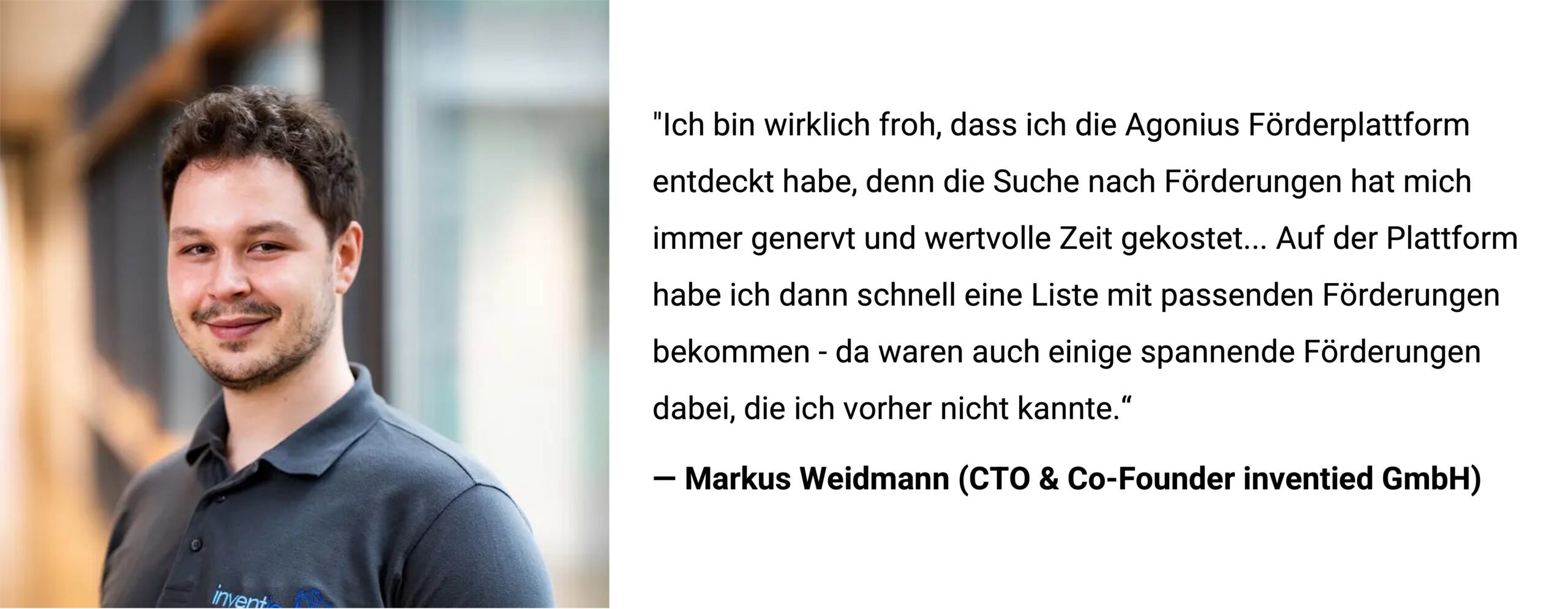 "Ich bin wirklich froh, dass ich die Agonius Förderplattform entdeckt habe, denn die Suche nach Förderungen hat mich immer genervt und wertvolle Zeit gekostet... Auf der Plattform habe ich dann schnell eine Liste mit passenden Förderungen bekommen - da waren auch einige spannende Förderungen dabei, die ich vorher nicht kannte.“