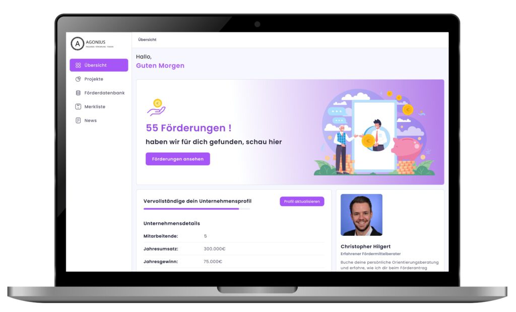 Agonius ist deine innovative Fördermittelplattform mit persönlicher Beratung.