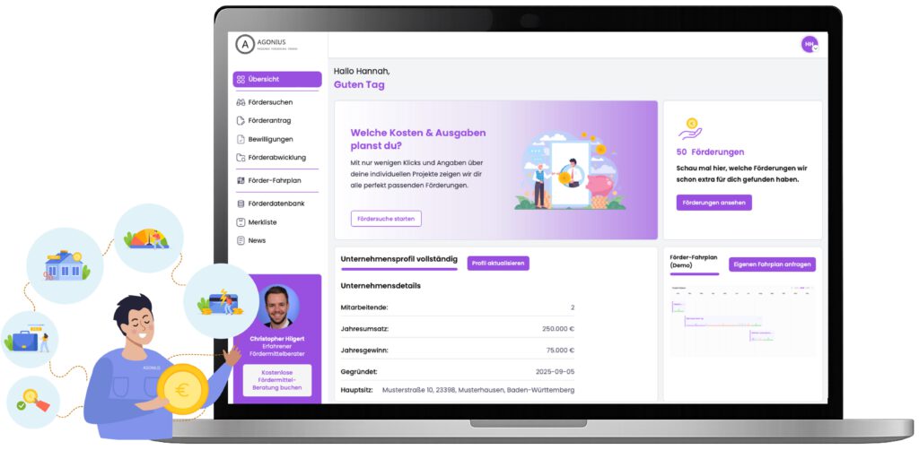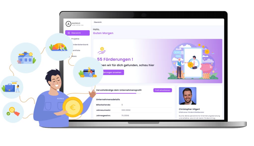 Die Agonius Förderplattform ist das Portal, über das passende Förderungen gefunden, verglichen und beantragt werden können. Hier können die eigenen Unternehmens- und Projektangaben angepasst, Förderungen recherchiert und aktuelle News eingesehen werden.