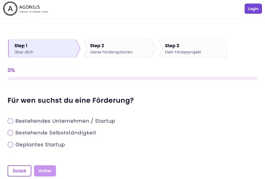 Beantworte nur wenige, intuitive Fragen über dein eigenes Unternehmen und der Förderguide identifiziert bereits erste passende Förderungen. Die Übersicht der passenden Förderungen siehst du nach der kostenlosen Registrierung auf der Agonius Fördermittelplattform.